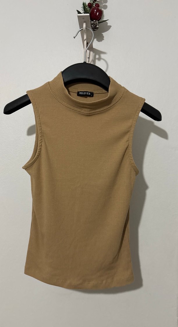 Bej renkte, kolsuz ve yarım boğazlı kadın atlet, ince ve vücuda oturan kesimiyle günlük rahat sokak tarzına uygundur.