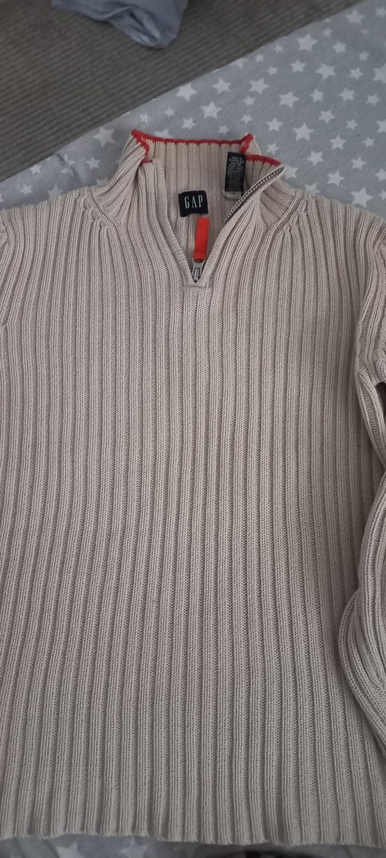 Fermuarlı yüksek yakalı, bej renkli, fit kesim erkek kadin kazak, yumuşak örgü kumaştan GAP markası.Ufak bir lekesi var