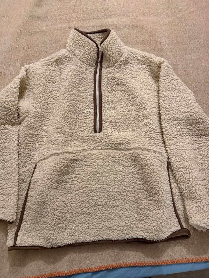 Bej renkli, yarım fermuarlı, uzun kollu, yüksek yakalı kadın polar ceket. Rahat kesimi ve normal uzunluğu ile günlük kullanıma uygundur.