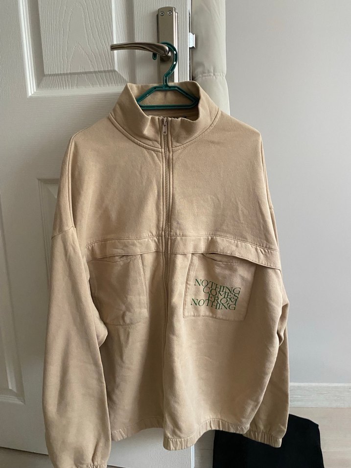 Yarım fermuarlı, yüksek yakalı, bej renk, bol kesim kadın sweatshirt. Yumuşak kumaştan, göğüs cebinde yazılı detay ve uzun kollu, günlük rahat giyim için uygun.
