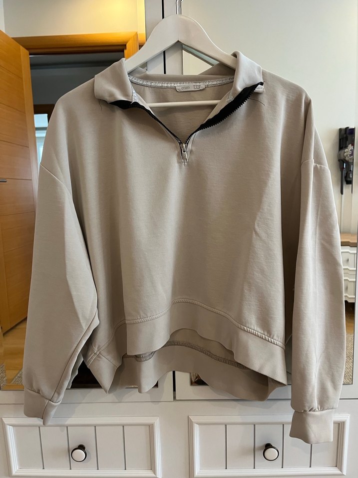 Yarım fermuarlı, yüksek yakalı, bol kesim kadın sweatshirtü. Bej renkte, uzun kollu ve yumuşak, sıcak kumaştan üretilmiştir. Günlük kullanıma uygun sokak stili.