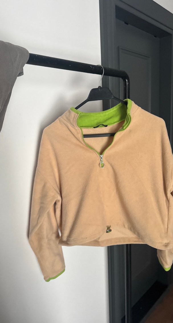 Bej renkli, yüksek yakalı ve uzun kollu kadın sweatshirtü, yumuşak ve sıcak kumaştan, bol kesimdir. Kısa boylu ve fermuarlı ön kısmı ile rahat sokak stili için uygundur.