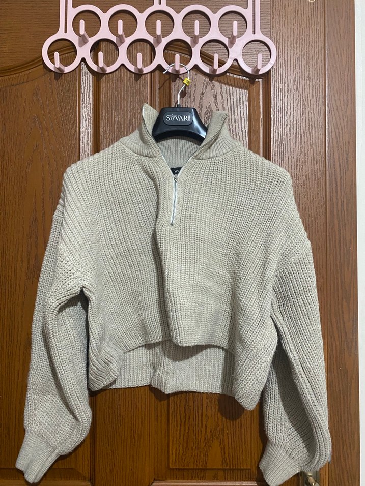 Bej renkli yün kazak, yüksek yakalı ve yarım fermuarlıdır. Uzun kollu, bol ve kısa kesimdir. Rahat örgü dokusu gündelik sokak stiline uygundur.