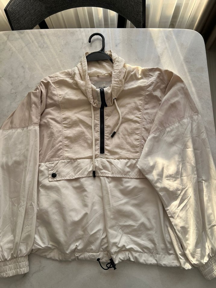 Bej renkte, yüksek yakalı ve uzun kollu kadın ceket. Rahat kesim ve yarım fermuarlı tasarıma sahip, hafif sentetik kumaştan üretilmiştir.