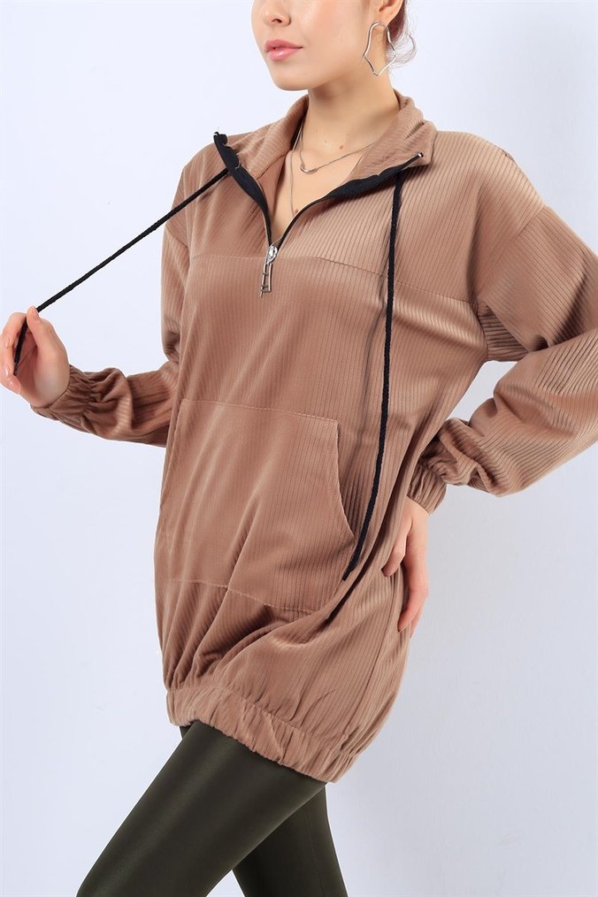 Bej Yarım Fermuarlı Rahat Kesim Sweatshirt
