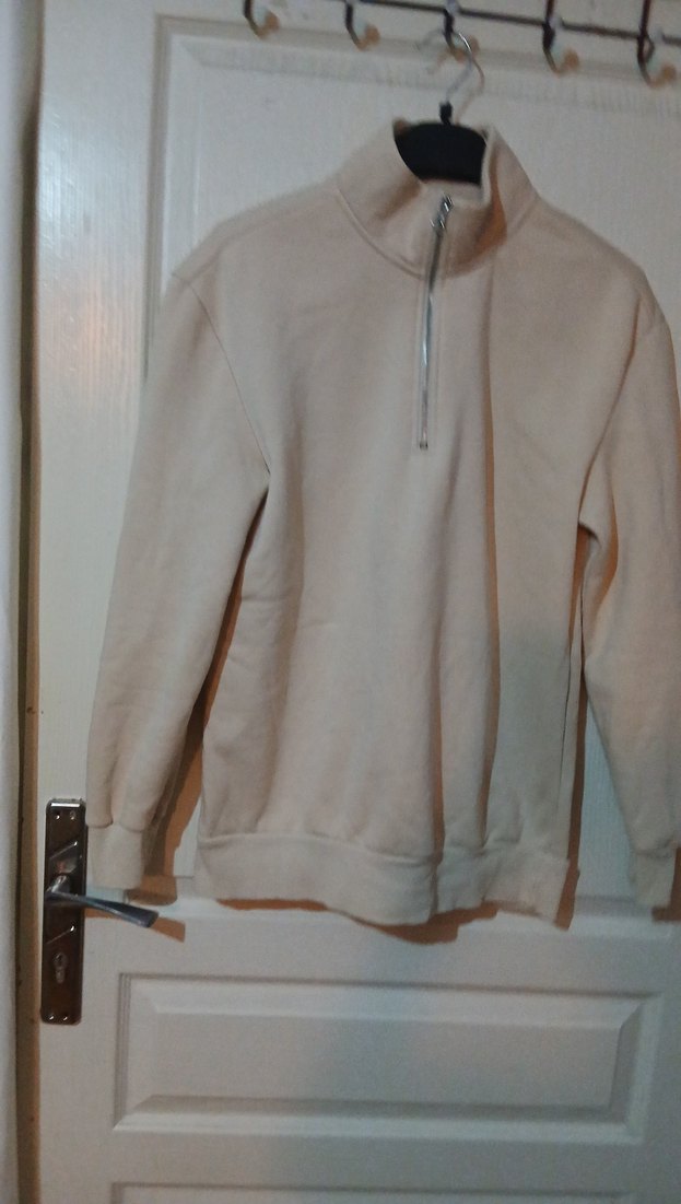 Yarım fermuarlı, yüksek yakalı ve uzun kollu bej sweatshirtü, rahat kesimi ve yumuşak dokusuyla günlük kullanım için uygundur.
