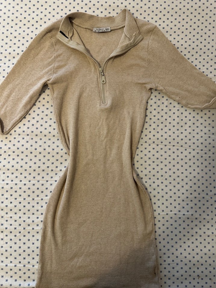 Yarım fermuarlı, yüksek yakalı ve uzun kollu bej triko elbise. Yumuşak keten kumaştan, günlük rahat kullanım için uygundur.