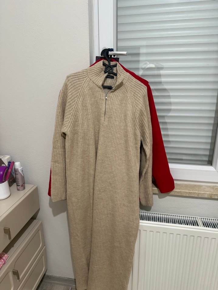 Yarım fermuarlı, yüksek yakalı ve uzun kollu, yumuşak yün kumaştan yapılmış bej tonunda, fitted uzun triko elbise. Günlük kullanıma uygun sade tasarım.