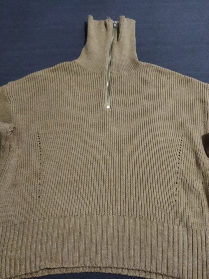 Yarım fermuarlı yüksek yakalı bej triko kazak, uzun kollu ve bol kesimdir. Rahat ve normcore tarzıyla günlük kullanıma uygundur.