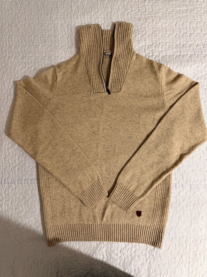 Bej renkte, yarım fermuarlı yüksek yakalı, yün örme kumaştan yapılmış, uzun kollu ve normal boyda erkek kazak. Günlük kullanım için uygun, sade ve desenizdir.