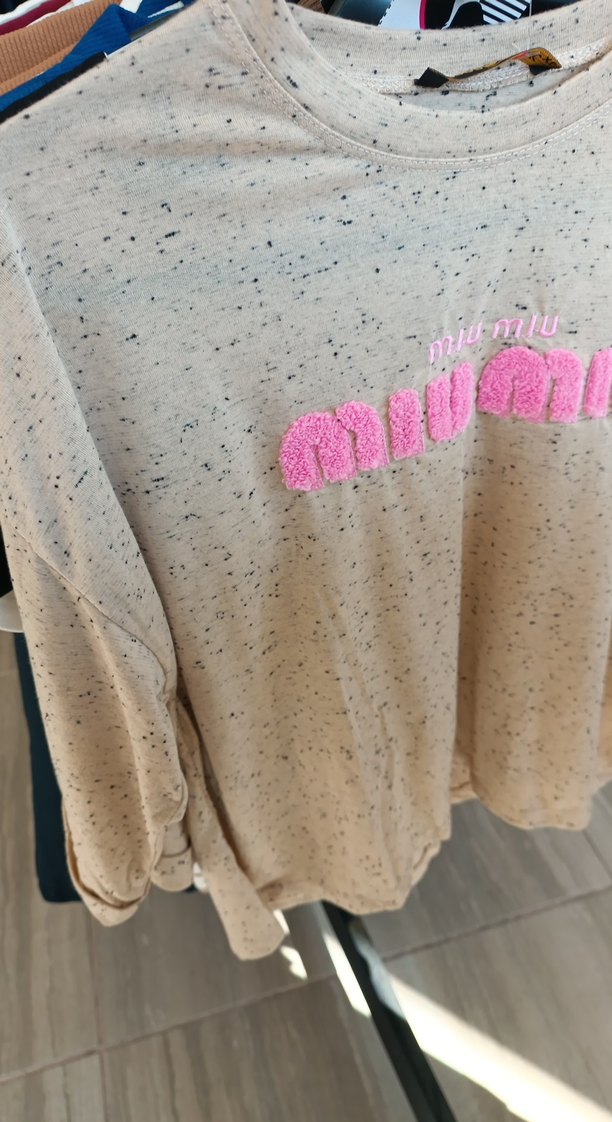 Bej renkte, yarım kollu, pamuklu ve örme kumaştan yapılmış tişört. Bol kesim ve yuvarlak yaka ile günlük sokak stiline uygun, pembe Miu Miu baskılıdır.