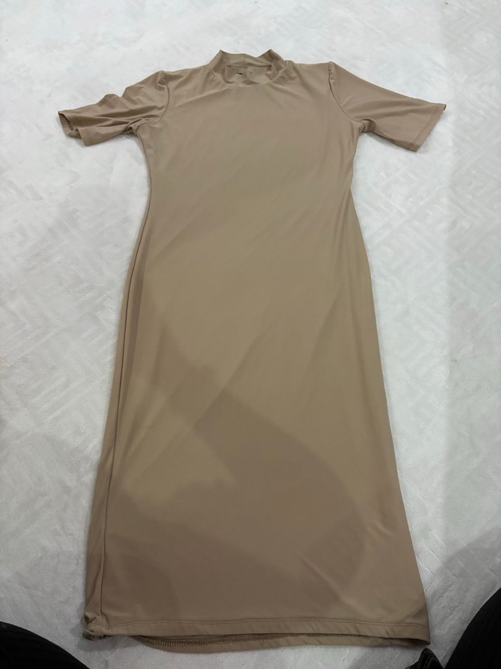 Bej renkte, yüksek yakalı ve yarım kollu uzun elbise. Sade ve minimal tasarımıyla günlük kullanıma uygun, vücuda oturan kesimde ve yumuşak sentetik kumaştan.
