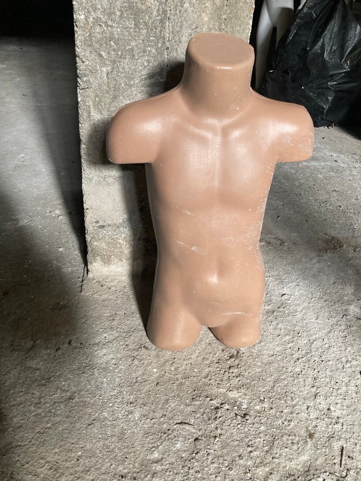 Kolları ve başı olmayan, gövde detaylarını gösteren pastel bej yarım vücut heykelcik. Sergileme veya sanat için uygundur.