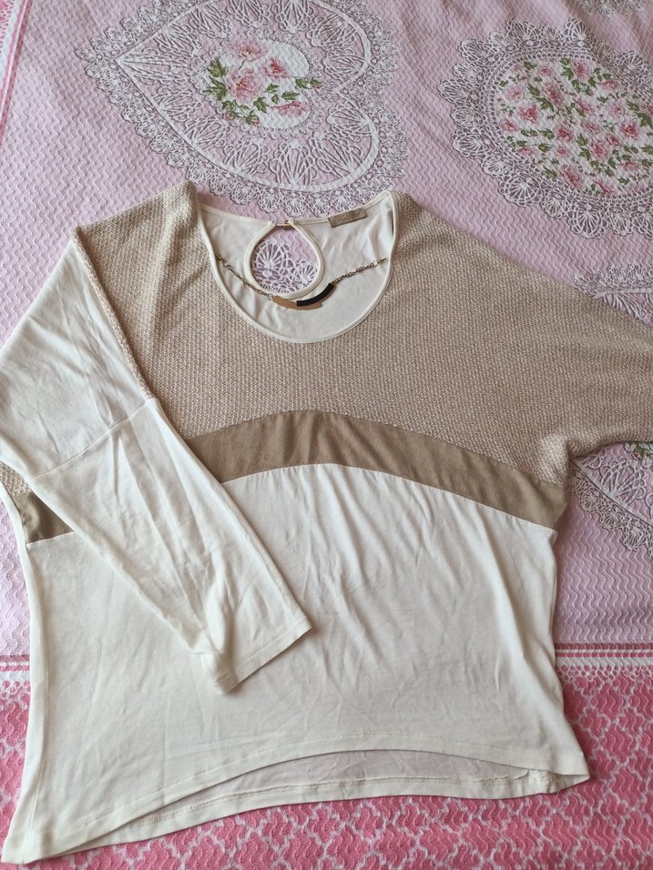Bej renkli, bol kesim, uzun kollu ve yuvarlak yakalı kadın bluz Üst kısmı örgü, alt kısmı yumuşak pamuk ince penye kumaş. Bohem tarzda, günlük kullanıma uygun pastel tonlarda.