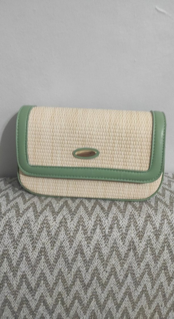 Bej renkli dokuma yüzeye ve yeşil şeritlere sahip, kemerli tasarımlı kadın bel çantası. Minimalist ve bohem tarzı yansıtıyor. çanta sıfırdır. içinde askısı vardır.