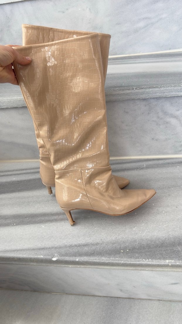 Yumuşak deriden bej renkte, yılan derisi desenli ve ince topuklu diz boyu çizme. Günlük şıklık için ideal, zahmetsiz bir tarz sunar.