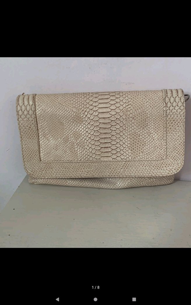 Bej renkli deri kadın çanta, yılan derisi desenli ve kemerli tasarıma sahip, günlük kullanıma uygun şık bir model.
