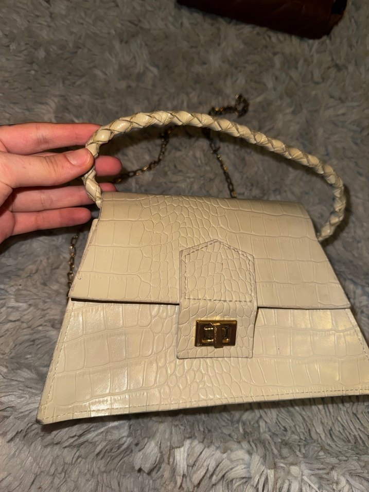 Bej yılan derisi desenli deri çanta, kürk detaylı ve örgülü saplıdır. Günlük kullanım için bohem ve klasik şıklık sunar.