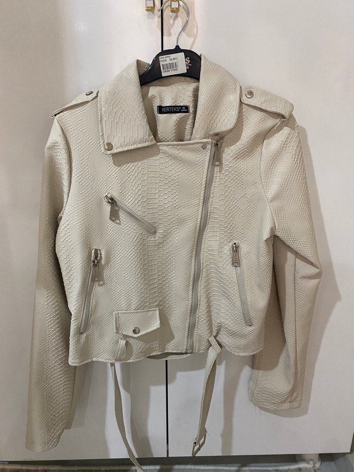 Bu kısa bej deri ceket, yılan derisi deseni ve kemerli bel detayı ile dar kesime sahiptir. Çentikli yakası ve askılı kolları ile trend sokak modasına uygundur.