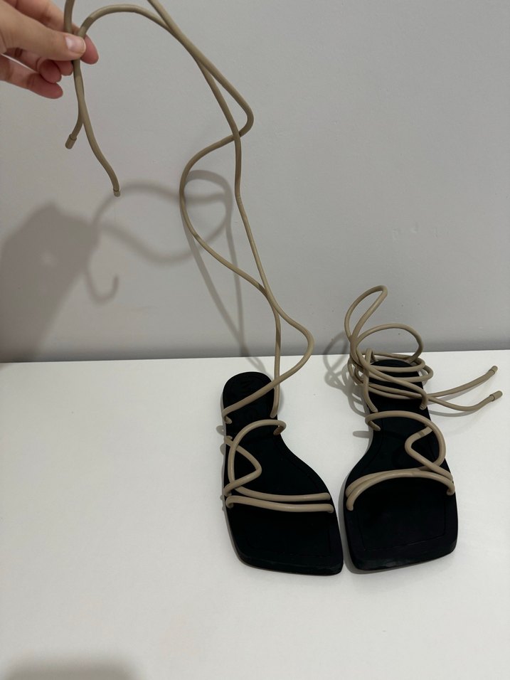 Bej yılan desenli, ince topuklu ve elastik bağcıklı kadın sandaletleri, günlük kullanım için rahat kauçuk tabanlıdır.