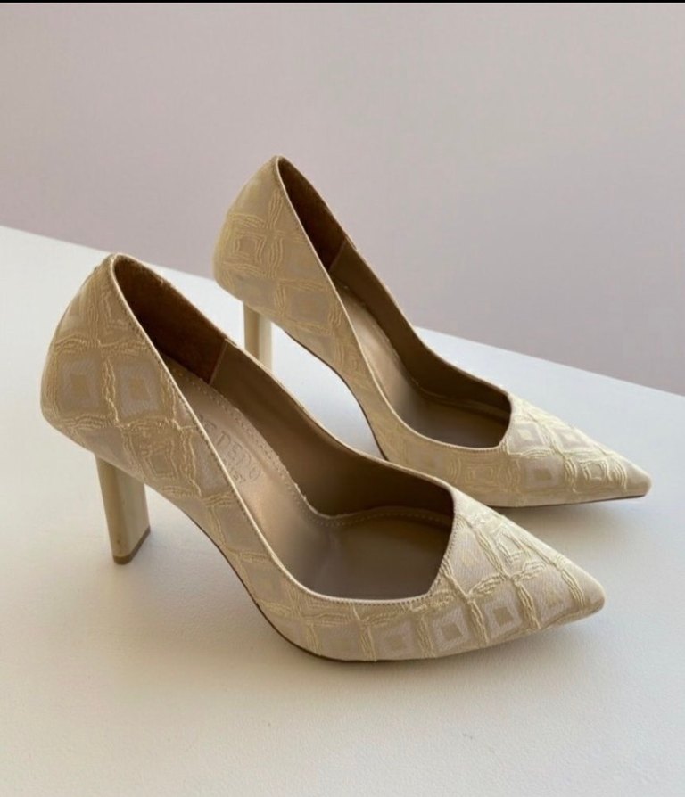 Bej yılan desenli ve dantel detaylı, sentetik kumaştan yapılmış modern klasik stilettolar, ofis için uygundur.