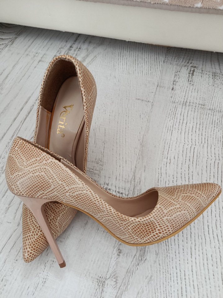 Bej Yılan Desenli Dantelli Stiletto