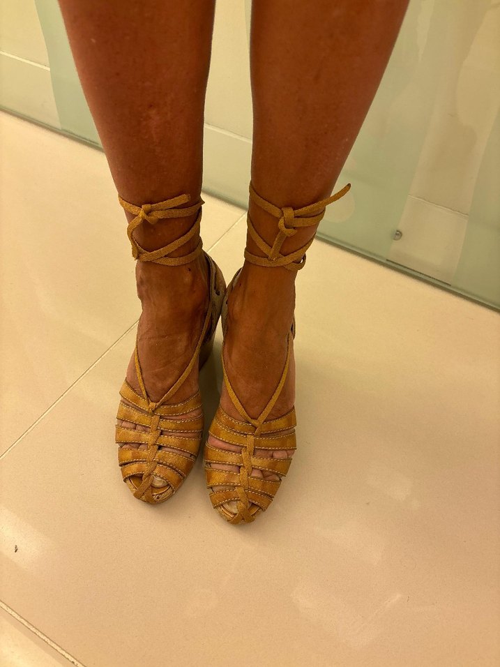 Bej yılan desenli deri dolgu topuklu sandaletler, parlak ve kemerli detaylara sahip, bohem tarzı yansıtıyor. Günlük kullanım için uygun.