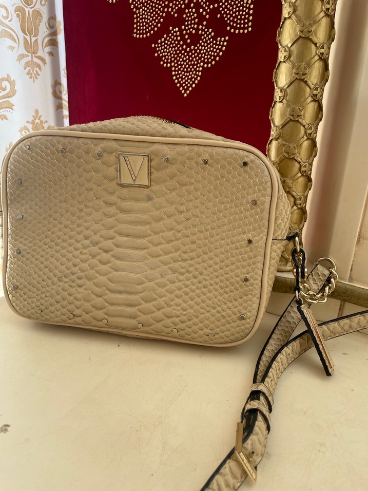 Bej yılan desenli deri çanta, fermuarlı kapama ve ayarlanabilir askıya sahip. Klasik Paris tarzında, günlük kullanım için uygun.