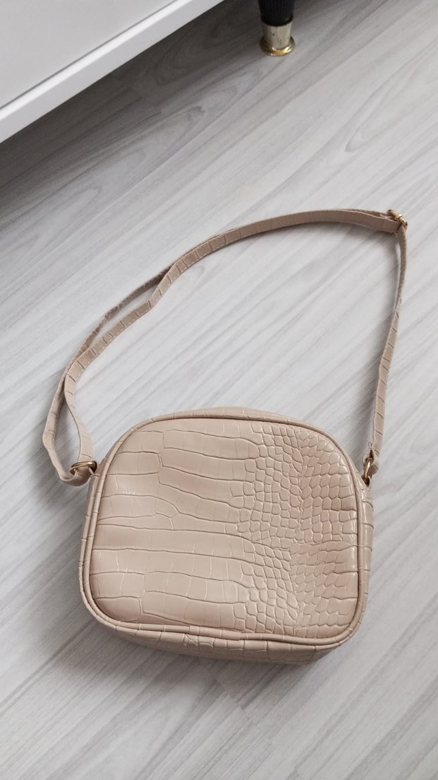 Bej renkli deri kadın çanta, yılan deseni ve tokalı ayarlanabilir askıya sahip, günlük kullanım için minimalist ve trend bir tasarım sunar.