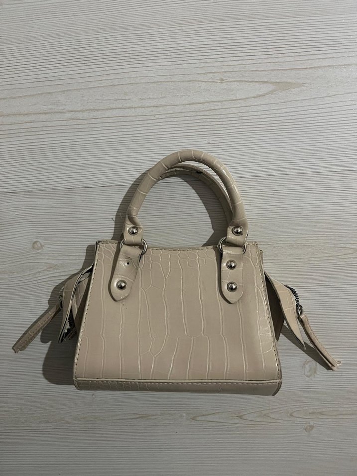 Yılan desenli, kemerli bej deri kadın çanta, trend sokak stili için uygun.