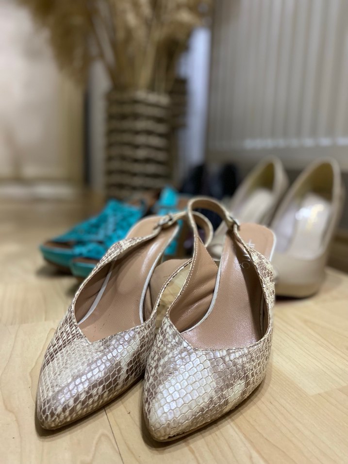 Bej yılan desenli dolgu topuklu, tokalı, yumuşak kauçuk malzemeden yapılmış kadın ayakkabısı. Günlük kullanım için çağdaş Paris tarzı.