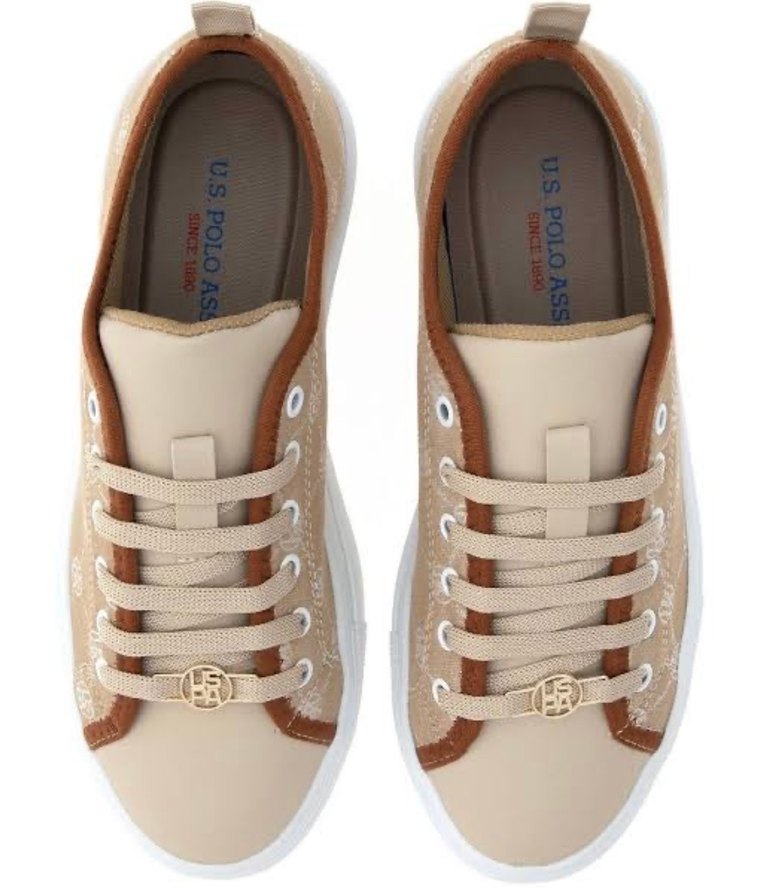 Bej yılan desenli süet malzemeden, bağcıklı ve dolgu topuklu kadın spor ayakkabısı. Sokak stiline uygun, günlük kullanım için ideal. U.S. Polo Assn. markalı.