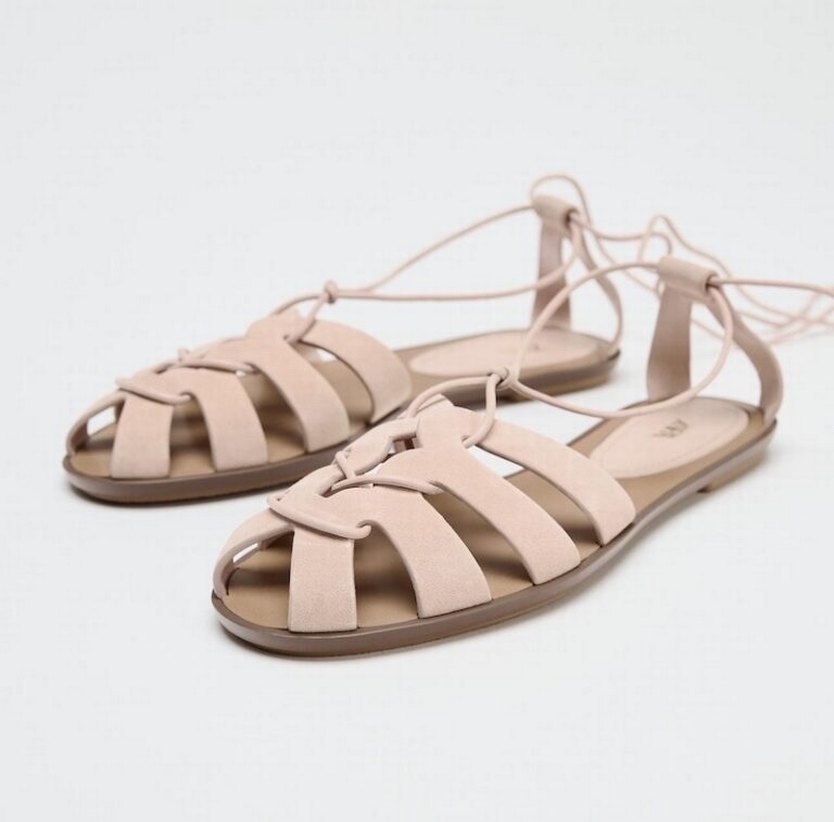 Bej süet dolgu topuklu sandalet, parlak yılan deseni ve tokalı detaylarla, romantik akşamlar için ideal. Zara, 39 numara.