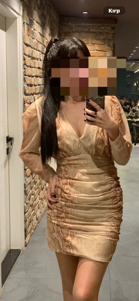 Bu bej yılan desenli midi elbise, V yaka ve uzun kollu olup drapeli detaylara sahiptir, romantik buluşmalar için uygundur. Bir kez giyildi marka temsili