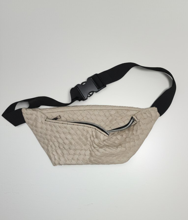 Bej renkli, yılan desenli ve siyah ayarlanabilir kemerli çapraz çanta. Önünde fermuarlı cep ve dokulu yüzey bulunur, sokak stiline uygundur.