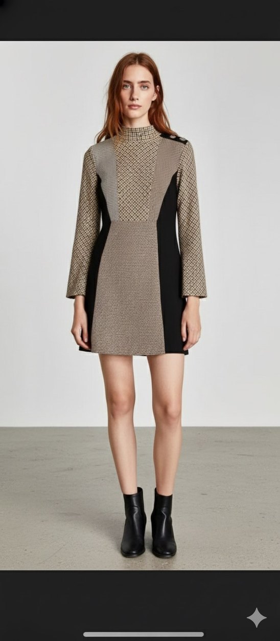 Bej yılan desenli midi elbise, yüksek yakalı ve uzun kolludur. Örme sentetik kumaştan yapılmış, çağdaş bir görünüm için yılan deseni ve gri paneller içerir, ofis için uygundur.