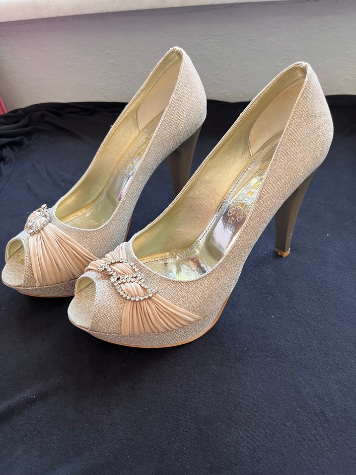 Sentetik kumaştan, bej renkte yılan desenli ve pilili detaylı yüksek topuklu kadın ayakkabısı. Düğünler için modern klasik tarzda.