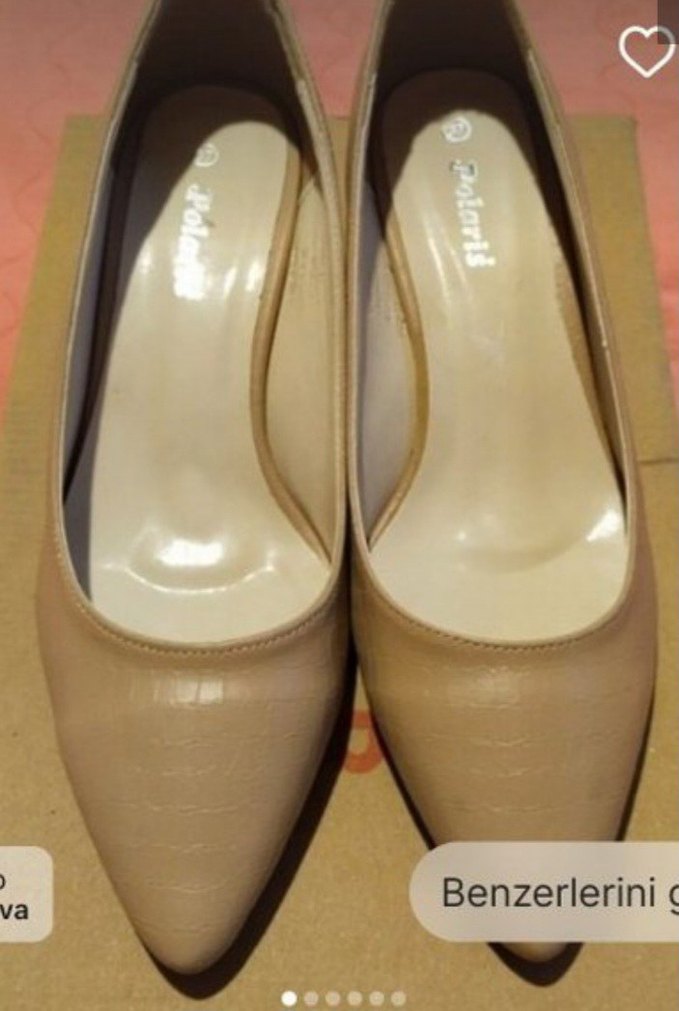 Bej yılan desenli, bağcıklı stiletto topuklu ayakkabı. Ofis kullanımı için klasik şıklıkta, kauçuk malzemeden üretilmiştir.