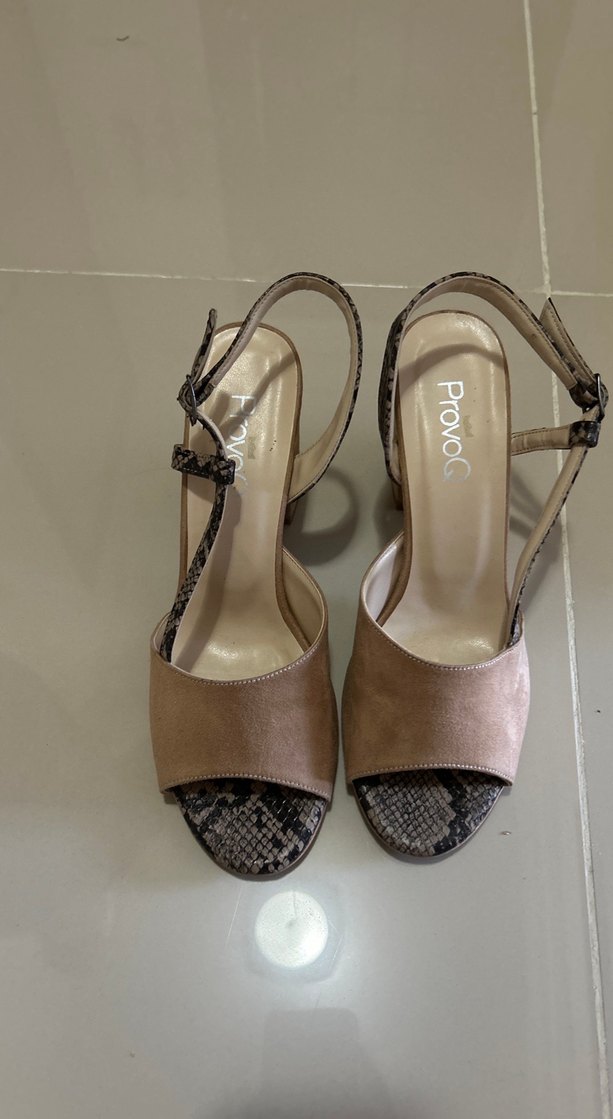 Bej süet platform topuklu, yılan desenli ve tokalı kayışlı kadın ayakkabısı. ProvoG markası, minimalist ve çağdaş tarz sunar.