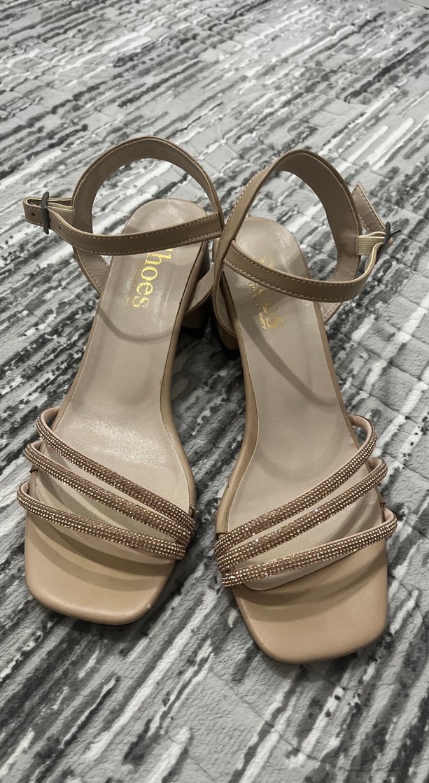 Yumuşak süetten yapılmış bej yılan desenli, tokalı bantlı blok topuklu abiye ayakkabılar. Düğünler için uygundur.