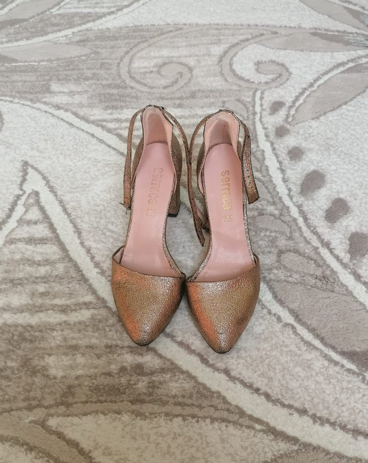 Bej yılan desenli süet topuklu kadın ayakkabı, parlak yüzey ve tokalı kayış ile klasik şıklık sunar.