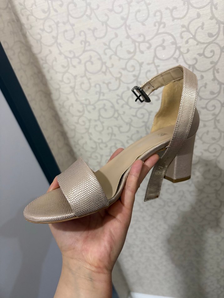 Yılan desenli bej, tokalı blok topuklu kadın ayakkabı. Kauçuk malzemeden yapılmış, romantik akşamlar için uygun.