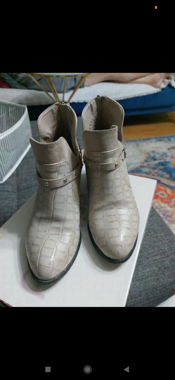 Bej renkli, yılan desenli deri kadın botları tokalı detaylara sahip. Kalın topuklu, günlük ve sokak stili için uygun. arkadan fermuarlı topuklardaki renkler temizlenince geçer sıritmiyor harika güzel ve rakat bir bot alan pişman olmaz 38 beden.cok az giyildi