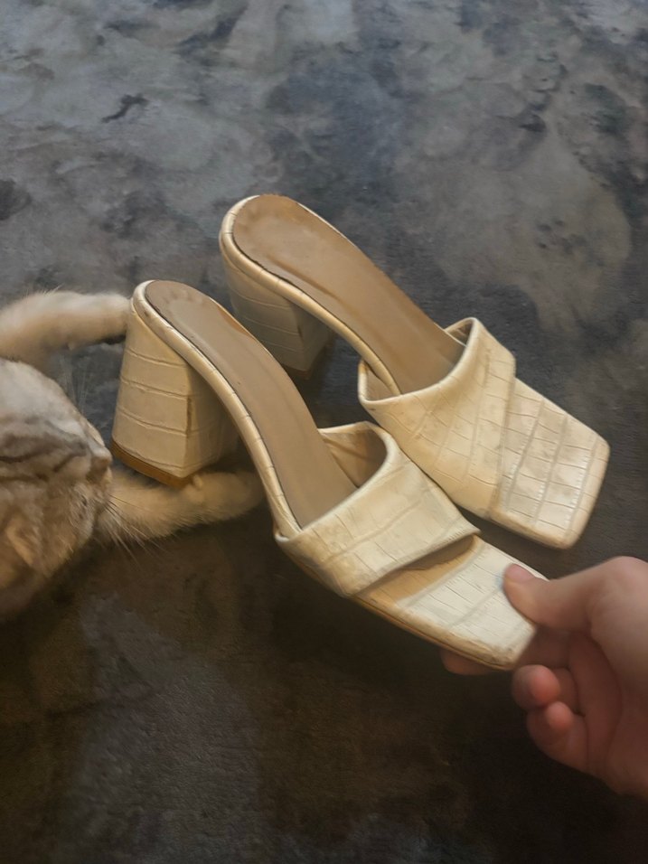 Bej renkte, tokalı kayışlı ve yılan desenli blok topuklu kadın terlik. Kauçuk malzemeden, günlük sokak stiline uygun.