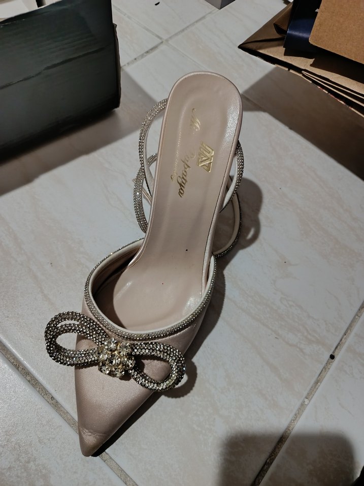 Bej yılan desenli, tokalı ve parlak görünümlü lastik malzemeden yapılmış stiletto topuklu ayakkabı, düğün için uygundur.