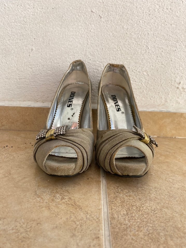 Yumuşak süetten yapılmış, yılan desenli ve tokalı bej renkli kadın topuklu ayakkabılar, düğünler için uygundur.