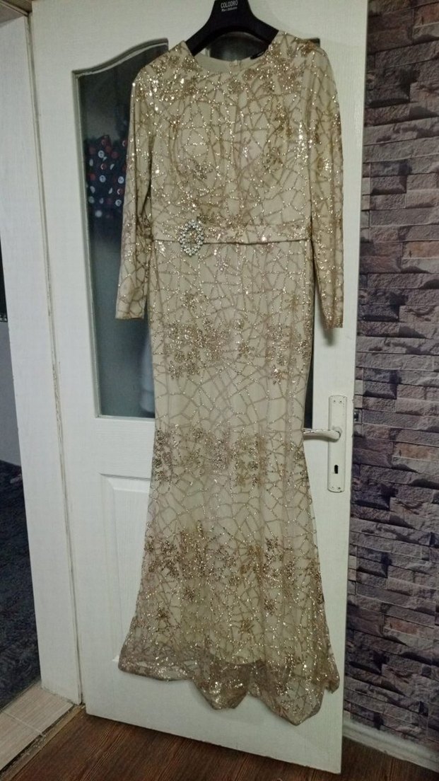Bej renkli, yılan desenli uzun abiye elbise, drapeli ve uzun kolludur. Kayık yaka ve klasik kesim ile düğünler için uygundur. ✨