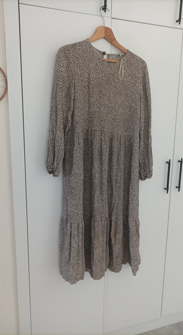 Bej renkli, yılan desenli uzun elbise. Uzun kollu, bol kesim ve yuvarlak yakalıdır. Sentetik kumaştan, fırfır detaylıdır. Günlük kullanıma uygundur. marka temsili