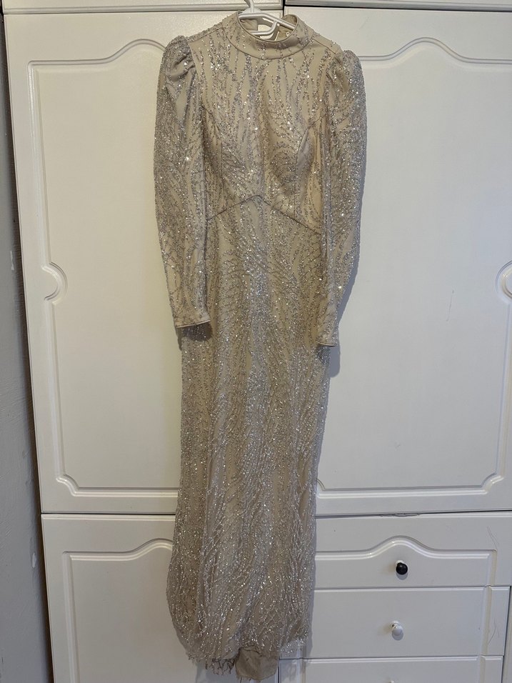 Bej Yılan Desenli Uzun Kollu Uzun Abiye Elbise