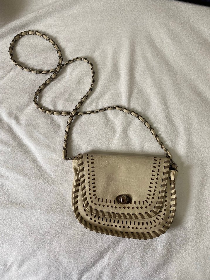 Bej renkte yılan desenli deri çanta, zincir askı ve detaylı dikişlerle bohem Paris tarzını yansıtıyor.